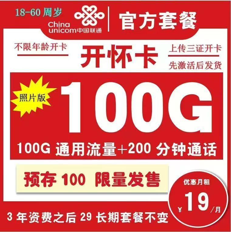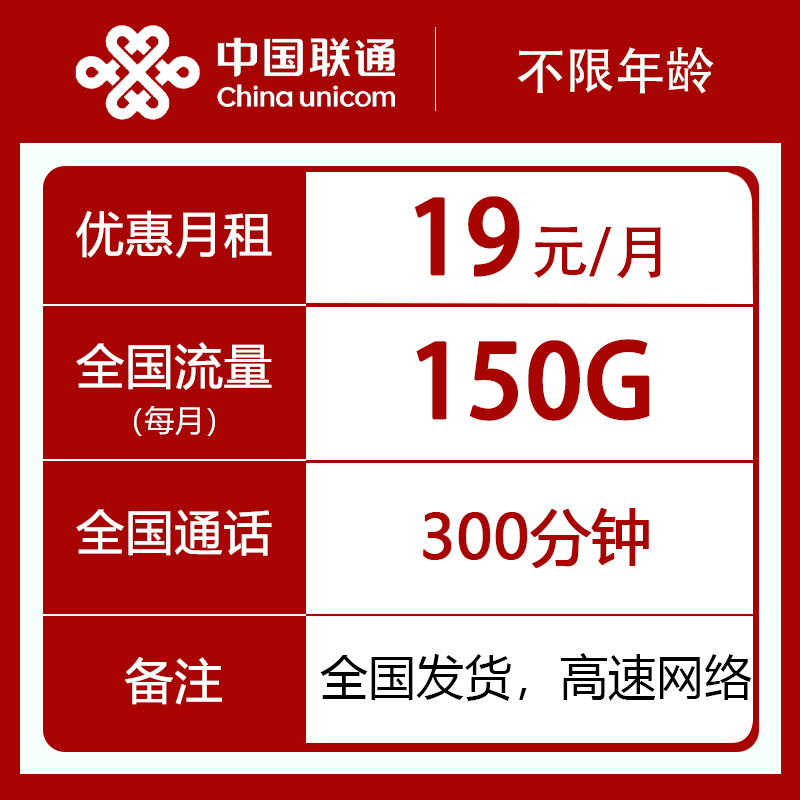 19元包150G+300分钟 长期套餐 年龄18-28岁 先激活后发货.